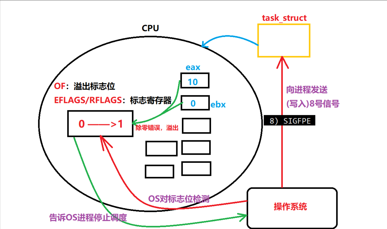 操作系统收到CPU发来的信息,发现进程不再被调度了,于是操作系统就会检查EFLAGS/RFLAGS寄存器的溢出标记位OF,从而检测出当前进程出了计算异常,于是 OS就对当前进程发送(向pcb内写入)8号信号 !
