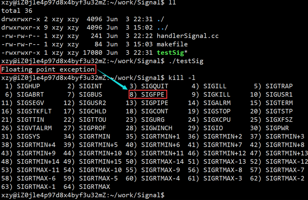 cpp#include <iostream> #include <unistd.h> #include <signal.h> #include <cerrno> #include <string> #include <cstring> #include <sys/types.h> int main(int argc, char* argv[]) { int a = 10; a /= 0; while(1) sleep(1); return 0; }除零错误会在Shell上爆出 Floating point exception 错误信息 ,并且除零错误对应的信号是 SIGFPE(8号信号) 。我们再来模拟一下野指针异常 :
