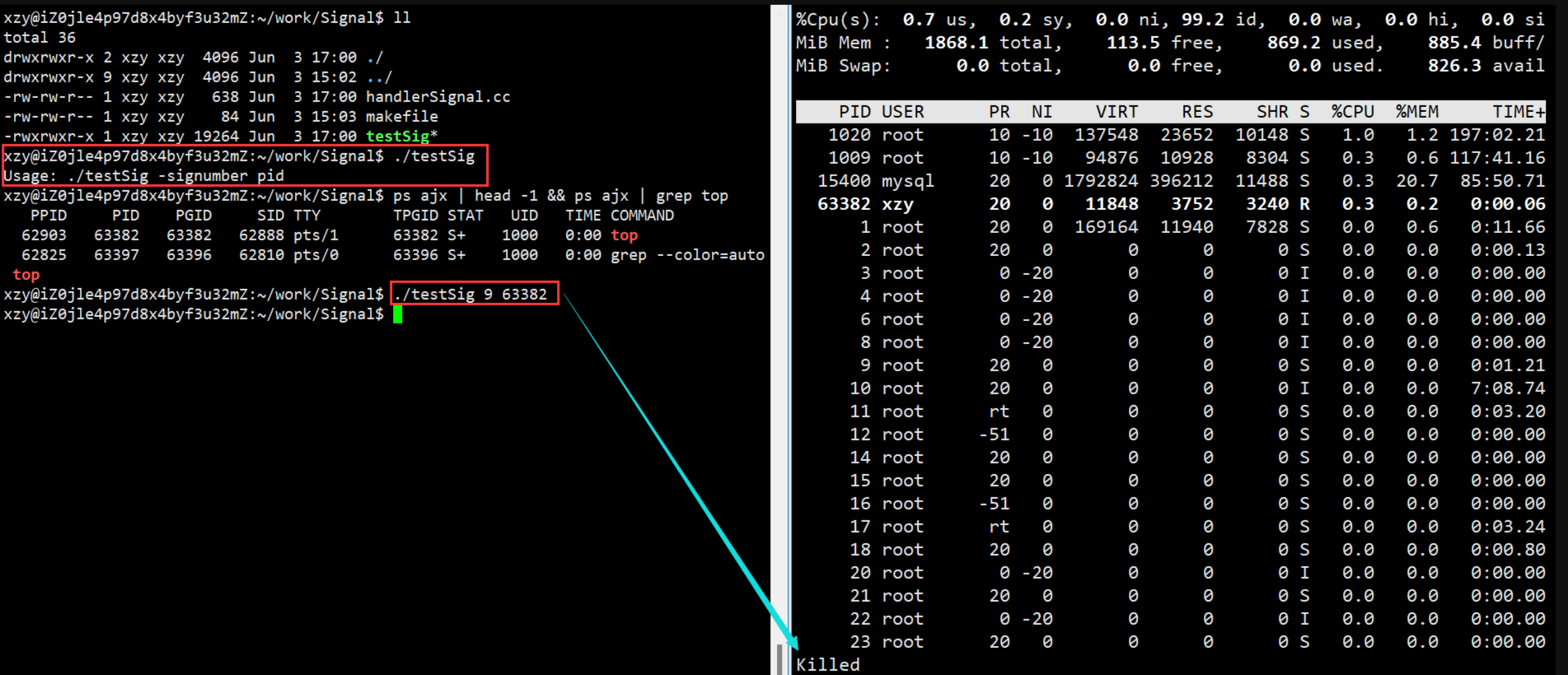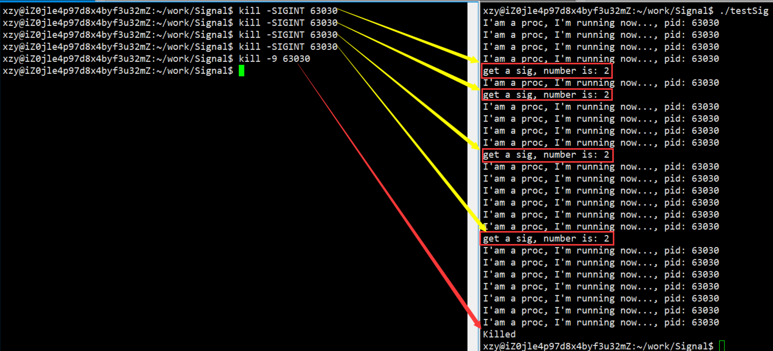 - 如果发送 SIGKILL 信号(编号为9),则表示强制终止目标进程,目标进程将无法捕获或忽略该信号。