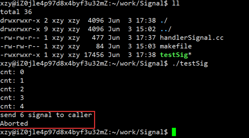 cpp#include <iostream> #include <unistd.h> #include <signal.h> #include <cerrno> #include <string> #include <cstring> #include <sys/types.h> int main(int argc, char* argv[]) { int cnt = 0; while(true) { std::cout << "cnt: " << cnt++ << std::endl; sleep(1); if(cnt == 5)// 5s 后abort进程 { std::cout << "send 6 signal to caller" << std::endl; abort(); } } return 0; }