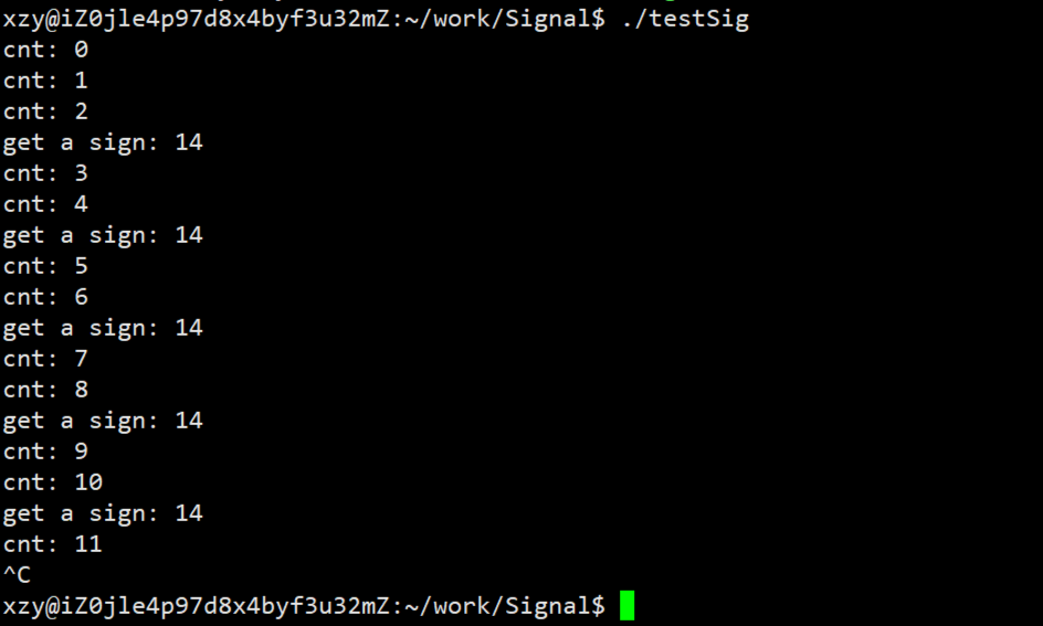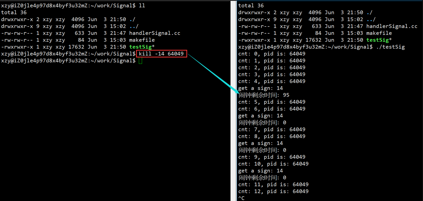 cpp#include <iostream> #include <unistd.h> #include <signal.h> #include <cerrno> #include <string> #include <cstring> #include <sys/types.h> void handler(int signo)// 收到闹钟信号进行回调 { std::cout << "get a sign: " << signo << std::endl; int n = alarm(2); // exit(0); } int main(int argc, char* argv[]) { signal(SIGALRM, handler); // 设置一个闹钟 alarm(4); int cnt = 0; while(true) { sleep(1); std::cout << "cnt: " << cnt++ << std::endl; } return 0; }如果我们设定一个闹钟需要很久之后才会响应,但是我在此期间发送14号信号提前对SIGALRM进行捕捉,执行handler方法的回调,返回值是什么呢?