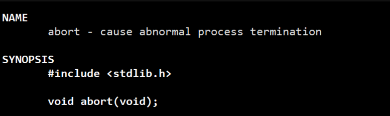 - 功能 :对自己发送指定的信号,为6号信号 SIGABRT。