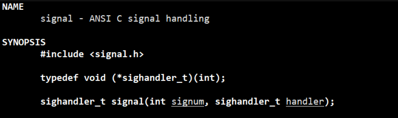 - handler参数 :handlder方法,此方法为自定义方法,当收到signum信号则不会执行该信号的默认动作,变为执行该方法。