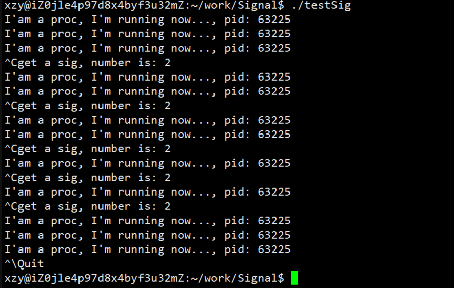 cpp#include <iostream> #include <unistd.h> #include <signal.h> #include <sys/types.h> void handler(int signo)// 回调函数,收到信号则执行handler方法 { std::cout << "get a sig, number is: " << signo << std::endl; } int main() { signal(SIGINT, handler);// 设置信号捕捉 while(true) { std::cout << "I'am a proc, I'm running now..., pid: " << getpid() << std::endl; sleep(1); } return 0; }在这个例子中,程序注册了一个用于处理