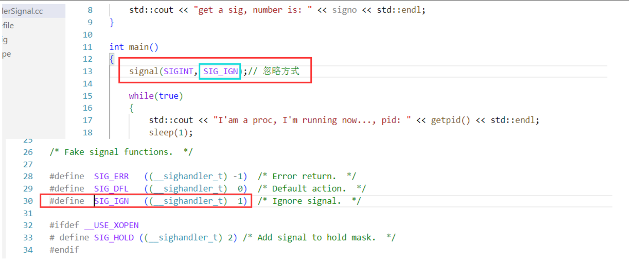在底层,SIG_IGN 是将整形1强转为 __sighandler_t 类型,于是就可以告诉OS,进程运行时以忽略的方式将 signal 函数的第一个参数忽略: