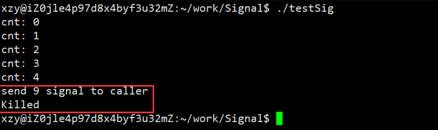 cpp#include <iostream> #include <unistd.h> #include <signal.h> #include <cerrno> #include <string> #include <cstring> #include <sys/types.h> int main(int argc, char* argv[]) { int cnt = 0; while(true) { std::cout << "cnt: " << cnt++ << std::endl; sleep(1); if(cnt == 5)// 5s 后退出进程 { std::cout << "send 9 signal to caller" << std::endl; raise(9); } } return 0; }除了raise系统调用之外,Linux还提供了一个 abort接口: