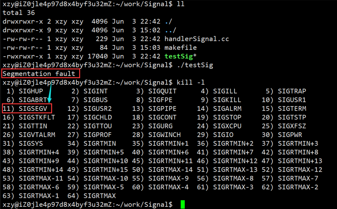 cpp#include <iostream> #include <unistd.h> #include <signal.h> #include <cerrno> #include <string> #include <cstring> #include <sys/types.h> int main(int argc, char* argv[]) { int* p = nullptr; *p = 50; return 0; }野指针异常 通常会爆Segmentation fault 错误 ,想必学C/C++的小伙伴对这种报错会经常见到,而其对应的异常信号为 SIGSEGV(11号信号) 。