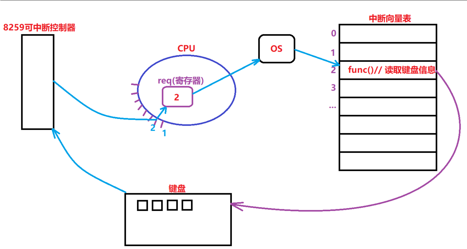 - 中断服务程序: 操作系统内核中有一个与键盘输入相关的中断服务程序,它被调用以处理键盘中断。
