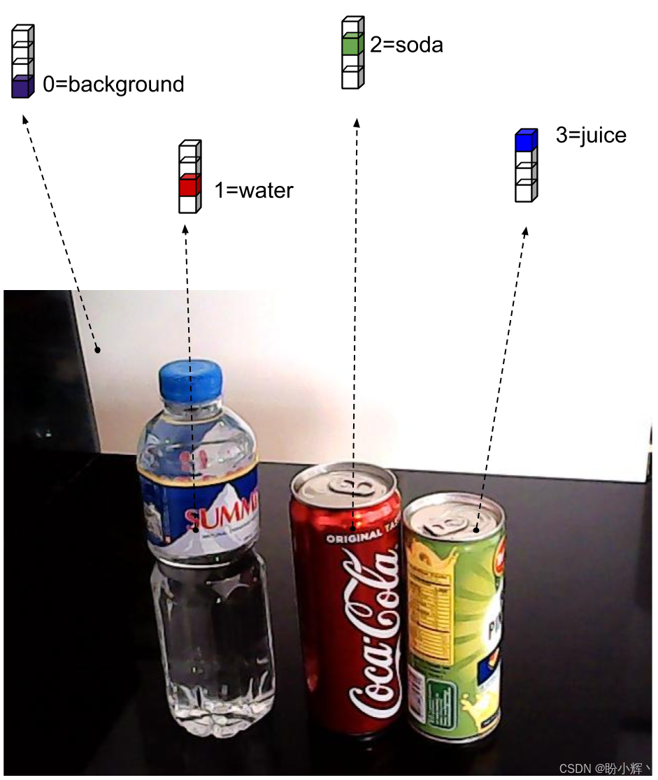 语义分割网络是一种逐像素分类器,与简单分类器仅生成单个独热向量输出不同,语义分割网络需要同时运行多个并行分类器。每个分类器都会生成独立的独热向量预测结果,其数量等于输入图像的像素总数,即图像宽度与高度的乘积。每个独热向量的维度则等于待识别材质物体类别的数量。以关注四种类别为例:背景、水瓶、汽水罐和果汁罐。