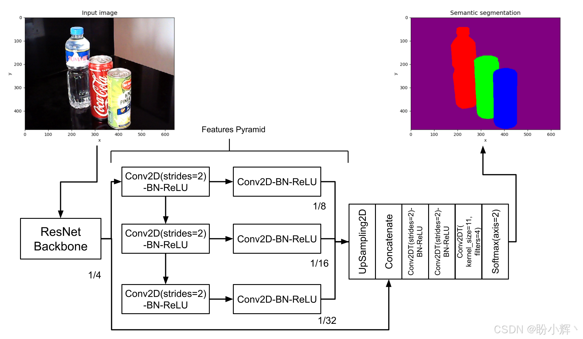 FCN 与 PSPNet 均对特征金字塔进行上采样,使其尺寸与第一组特征图保持一致。随后使用 Concatenate 层融合所有上采样特征。接着通过两次步长为 2 的转置卷积处理拼接后的特征,恢复原始图像尺寸。最后采用核大小为 1、卷积核数为 4 (即类别数)的转置卷积层和 Softmax 层,生成逐像素类别预测。