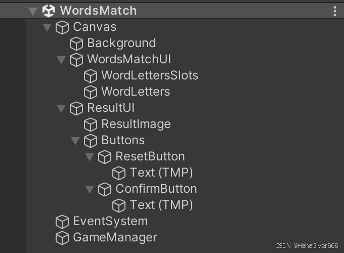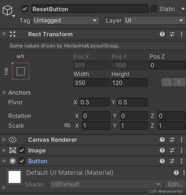 在Canvas下面新建一个名为ResultUI的游戏物体,在其下新建一个Image名为ResultImage,新建一个按钮容器Buttons并添加Horizontal Layout Group组件,在Buttons容器下新建两个按钮,一个是ResetButton重置按钮,另一个是ConfirmButton提交按钮。