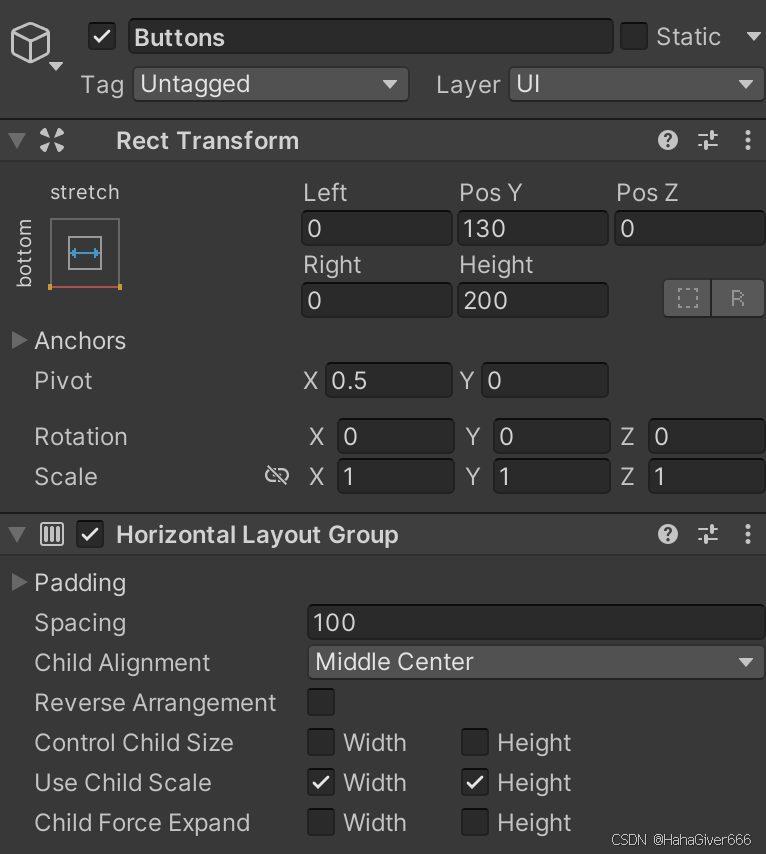 设置Buttons容器上Horizontal Layout Group组件的参数,以UI界面的底部为锚点,设置为居中排列,间隔为100,并使用子物体的宽高。