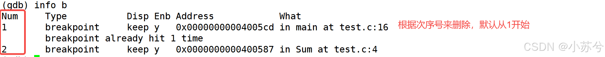 删除序号为 n 的断点 | delete breakpoints 1 |