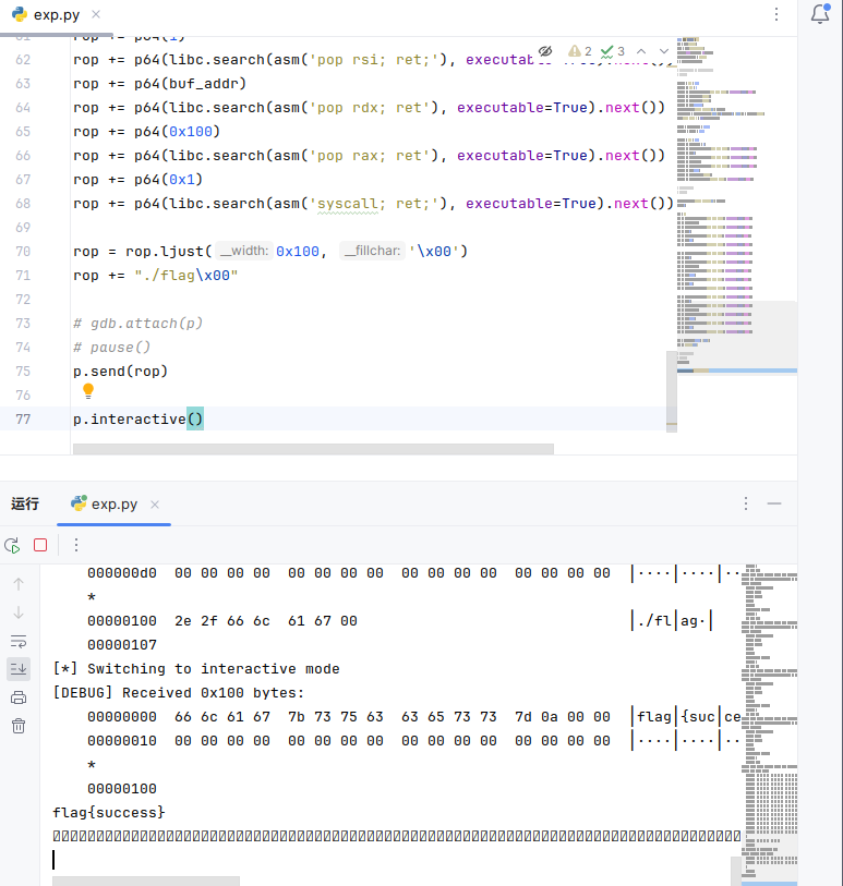 这里用来构建 ROP 链,然后在buf_addr = rw_mem + 0x100位置用于存读进来的 flag
