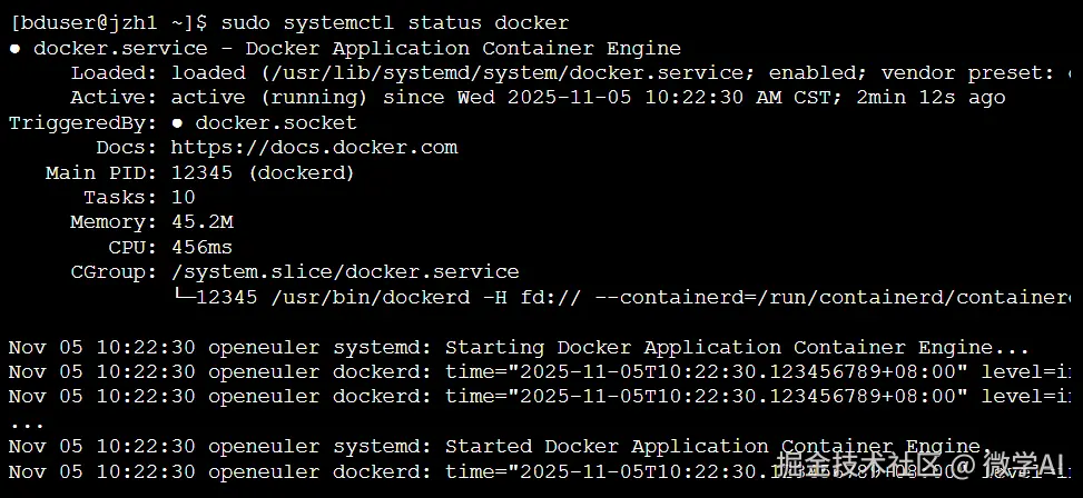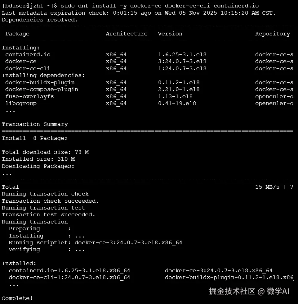 本部分将完整演示在openEuler22.03 LTS 服务器上安装 Docker 引擎 (Docker Engine) 的全过程。操作假设用户已具备 root 或 sudo 权限。