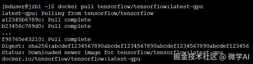 我们的项目将使用 TensorFlow 官方提供的、内置 GPU 支持的 Docker 镜像。 【拉取 TensorFlow 镜像模拟终端输出】