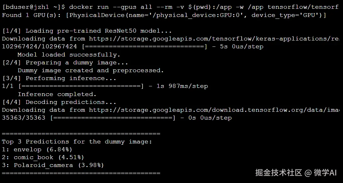 输出清晰地展示了脚本的执行流程:首先确认找到 GPU,接着加载模型并进行推理,最后给出了(由于是随机数据)一个看似合理的分类结果列表 。这标志着我们成功地在openEuler上通过 Docker 容器化地运行了一个 GPU 加速的 AI 应用。