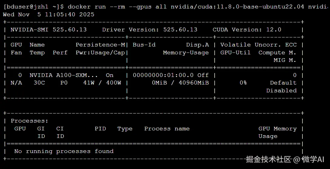 在运行 AI 应用之前,必须确认 Docker 容器能够正确识别并使用主机的 NVIDIA GPU。这需要主机已正确安装 NVIDIA 驱动和 NVIDIA Container Toolkit。我们可以通过运行一个简单的 nvidia-smi 命令来验证。