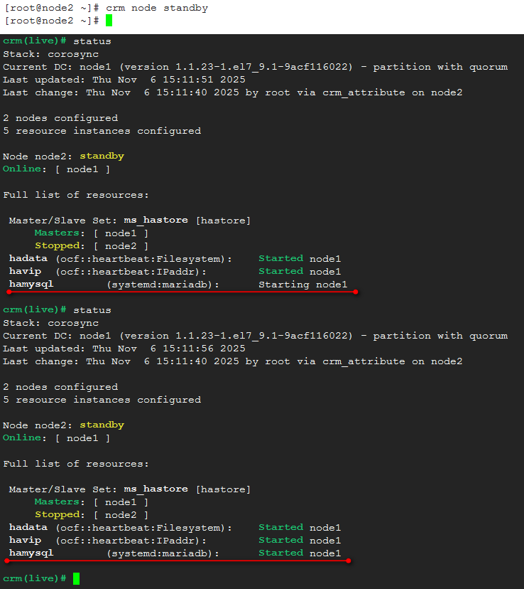 可以看到,ip,mysql服务、数据以及drbd的master在同一节点node2上,将node2切换到standby:
