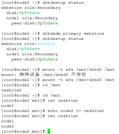 在node2上,将drbd切换为primary状态,然后挂载文件系统