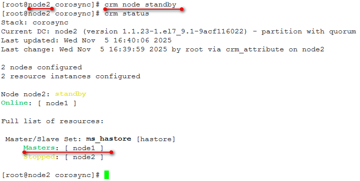 进行节点切换,将node2切换为standby模式,可以看到Master资源转移到noe1,而node2处于stop状态。