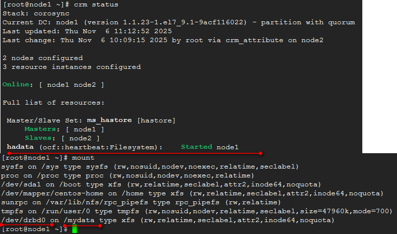 可以看到,ms_hastore的Master转移到node1上,hadata,即文件系统资源在node1上挂载。