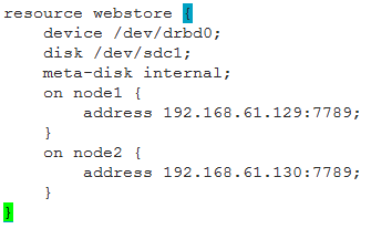 4、定义一个资源 ,使用*.res文件,如:/etc/drbd.d/mystore.res: