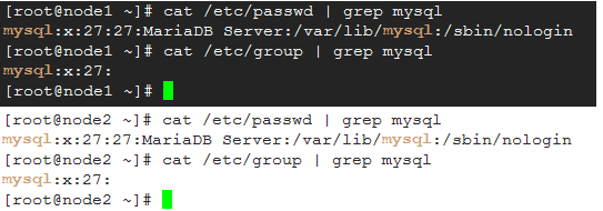 两个节点上的mysql用户和组必须名称和id完全一致;