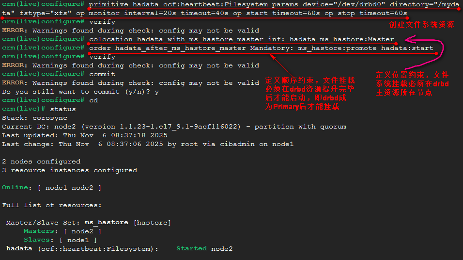 在每个节点上创建/mydata目录,集群创建文件系统资源,使主资源节点挂载/dev/drbd0到此目录。只能主资源节点挂载。文件系统资源必须跟主资源在一起,而且,必须是drbd资源提升为Primary角色后,才能进行文件系统挂载。即先定义文件系统资源,然后定义位置约束,使文件系统必须与drbd主资源在一起,最后定义顺序约束,文件系统挂载必须在drbd资源升级为Primary角色之后挂载。