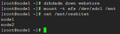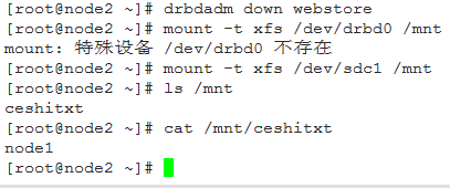 可以看到,node2上的镜像分区中已经有ceshitxt文件了,并且内容一致。但是,一定要注意的是,这两个ceshitxt文件不是同一个文件,而是不同磁盘上的两个不同的文件,只不过内容一致。