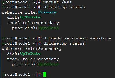 在node1上,卸载已挂载的文件系统,然后将drbd切换到secondary状态