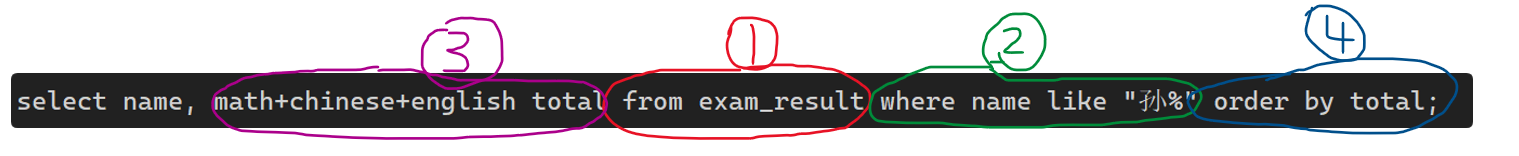 mysql> SELECT name, chinese, math, english, chinese + math + english 总分 FROM exam_result