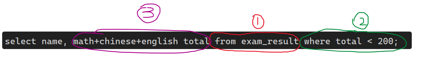 select name, total from exam_result where math+chinese+english total < 200;。答案是不行的,语法上错误。 - 所以想要筛选总分,只有上述一种写法,要牢记。