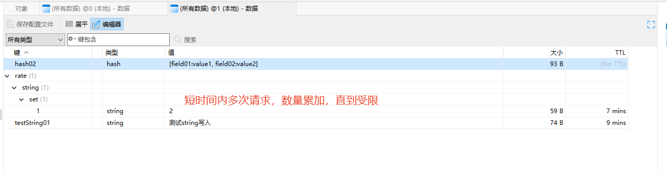 请求次数:限流使用,在调用CheckRateLimitAsync事件的时候设置了key为1,在达到指定测试会return报错提示,示例: 多次请求后数量累加: