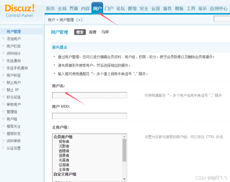 3、在菜单中点击"用户",在"用户管理"中搜索用户名
