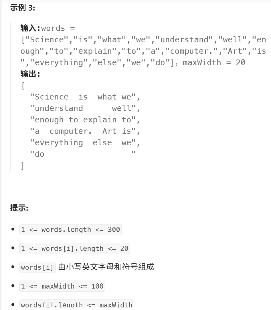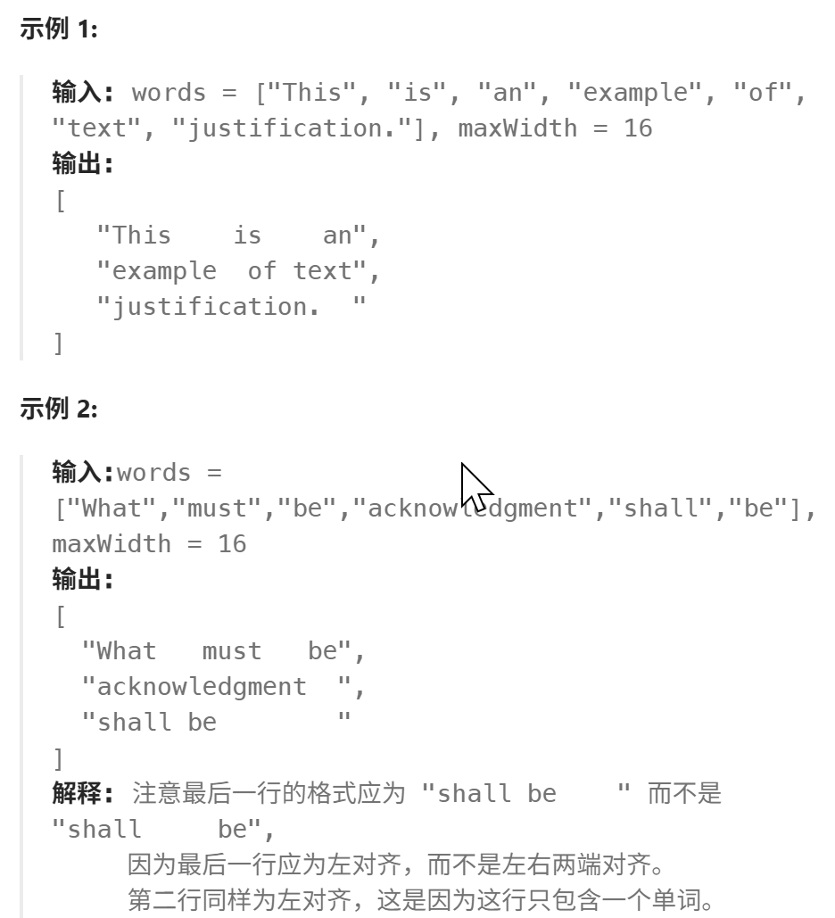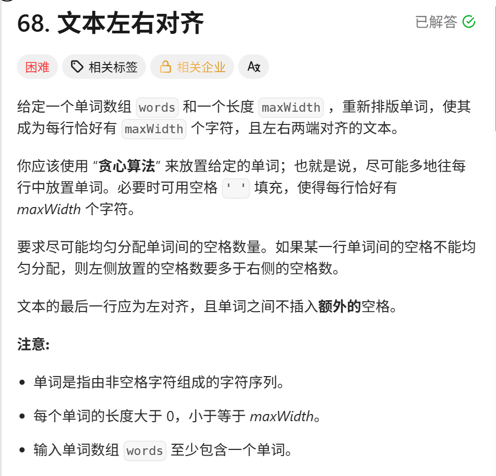 这道题好繁琐啊,我的思路是一个一个单词判断,每一个都加上两个单词之间的空格去看长度是否超过maxWidth,如果超过了,进行判断,只有一个单词或者到了最后一行,直接左对齐,后面填充空格,超过一个单词,进行计算每个单词之间的空格的个数,进行填充,一个一个累加,最后加入最终的结果列表。