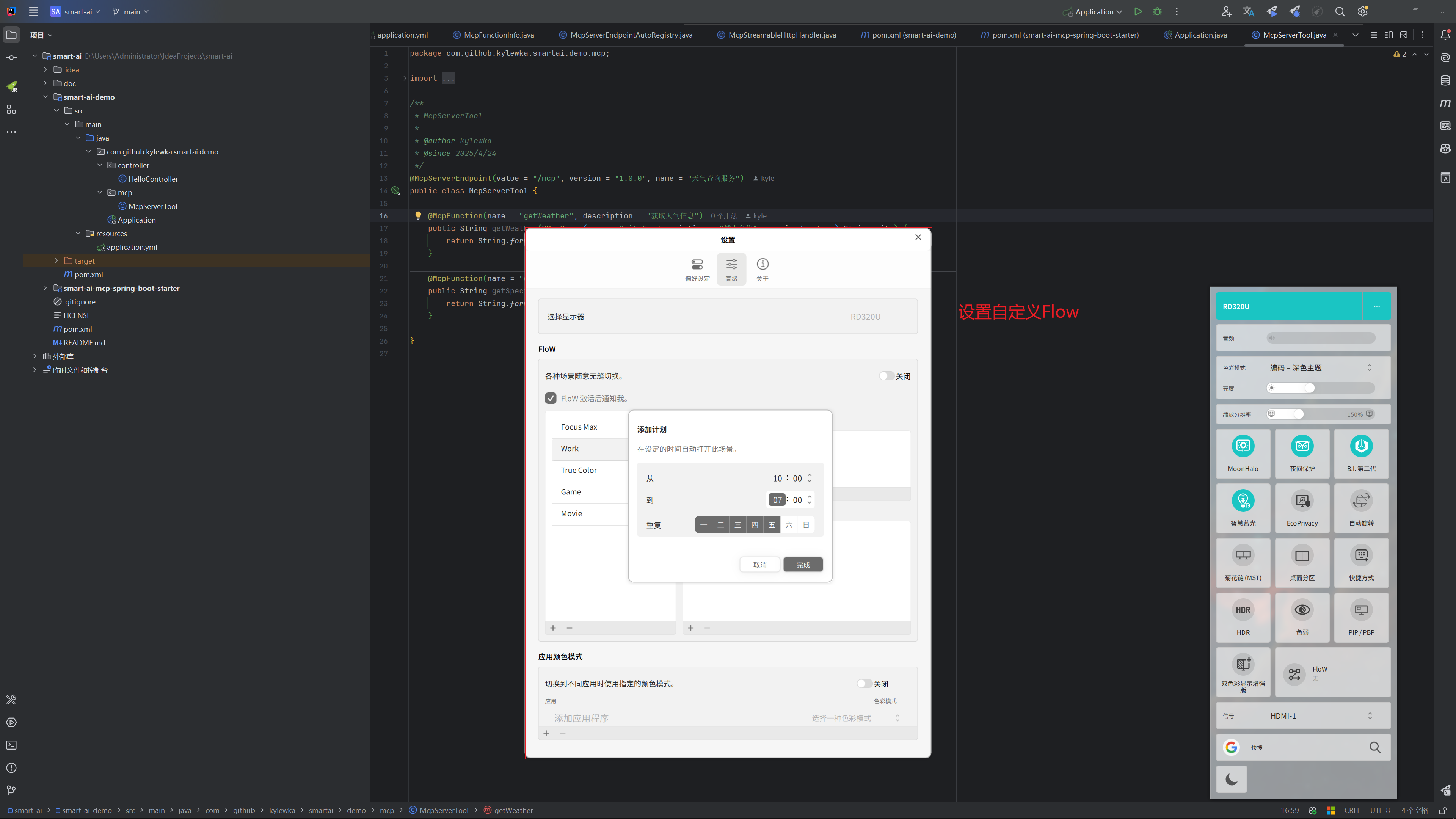 **Display pilot2软件-Flow功能:非常强大!**可以根据工作日期,一键设置自定义模式,甚至可以细节到对应应用开启不同色彩模式,当你上班开启电脑时,打开Idea,已经自动帮你切换成编程模式,无需手动切换。