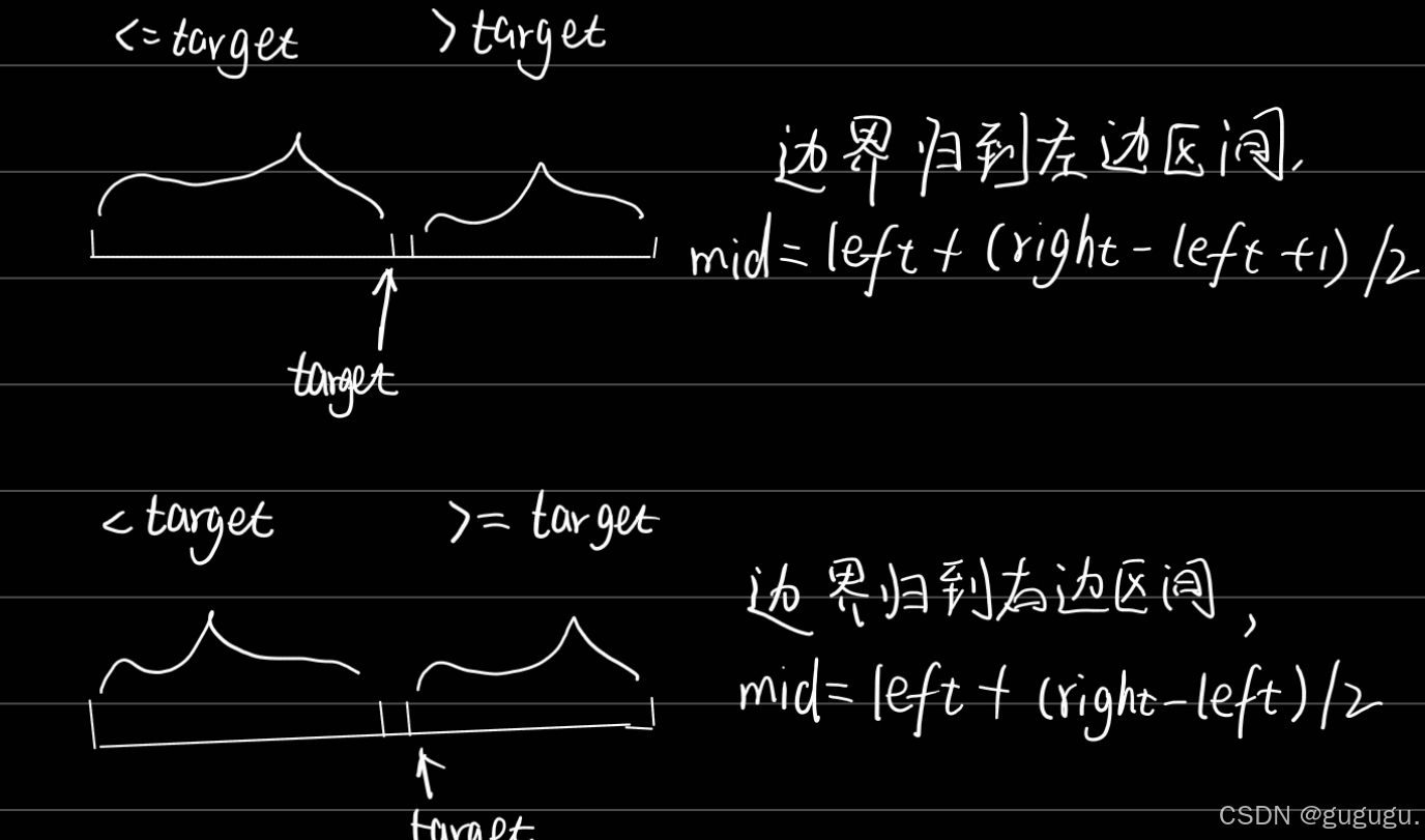 如果我们把边界归到了左边区间,就用mid = left + (right - left + 1) / 2,
