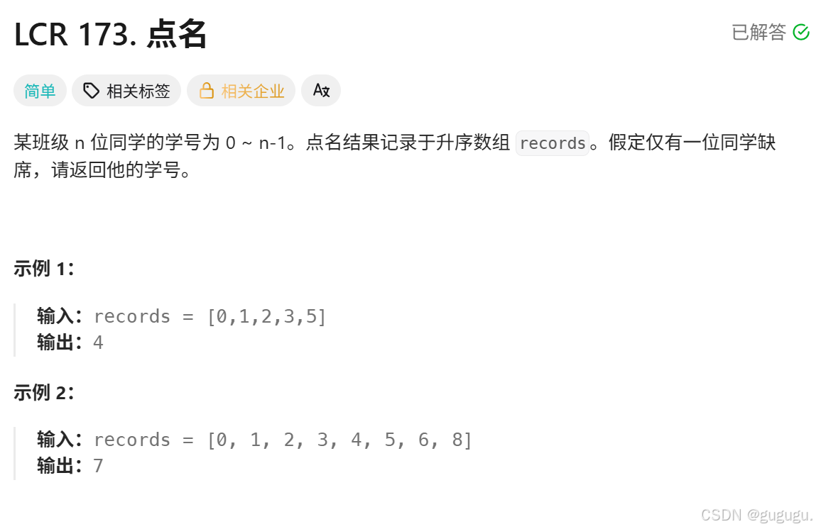 //非常巧妙的二段性划分,缺失同学前面的同学的学号等于下标