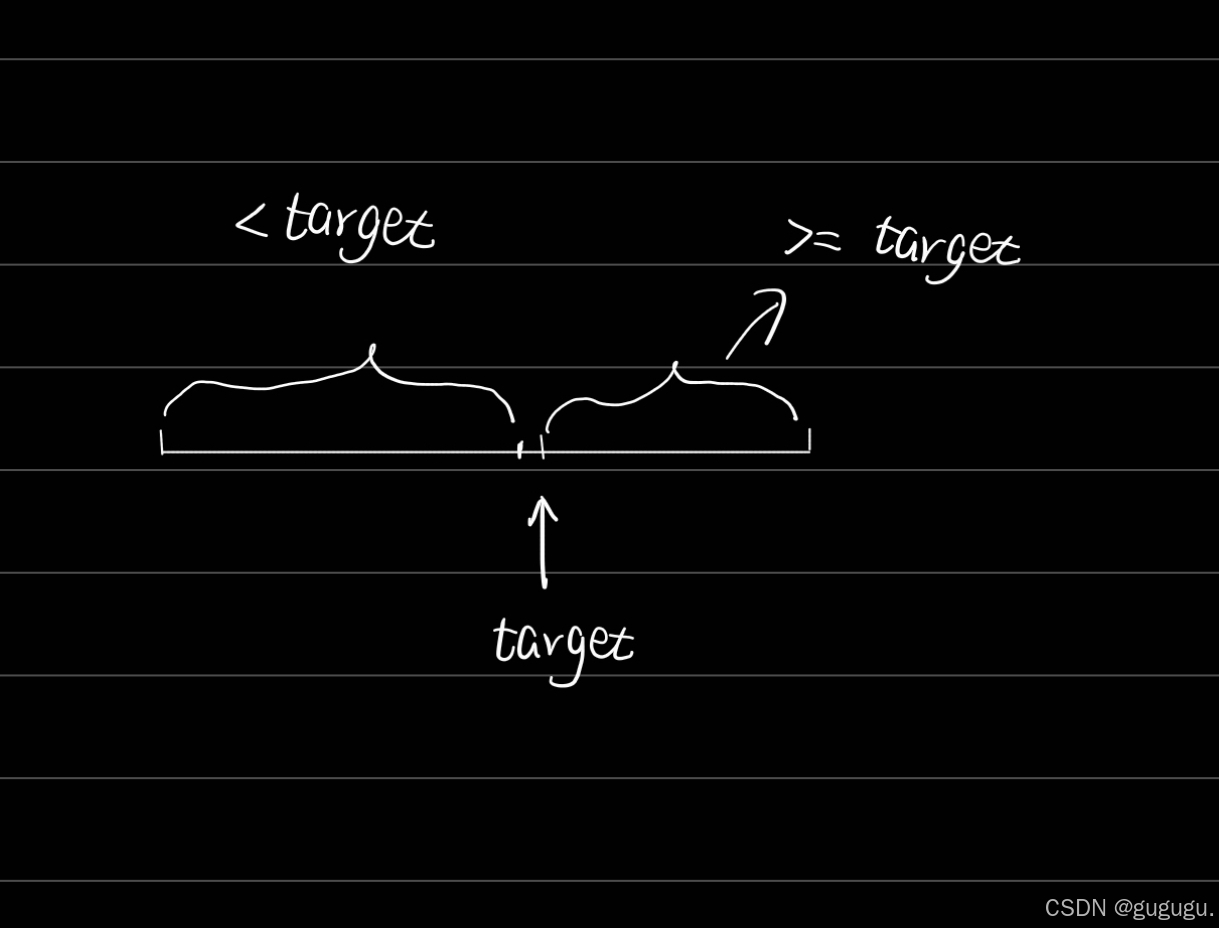 数据的二段性是啥?显然是target左边的数据都小于target,右边的数据都大于等于target。