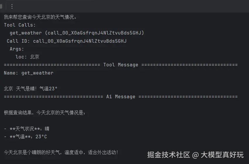 执行结果显示工具函数成功执行,返回了北京的天气信息。