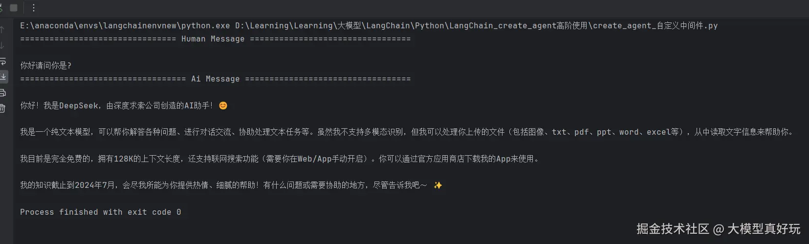 执行结果显示智能体使用了 DeepSeek 模型进行响应,这表明中间件成功根据用户级别动态选择了模型。