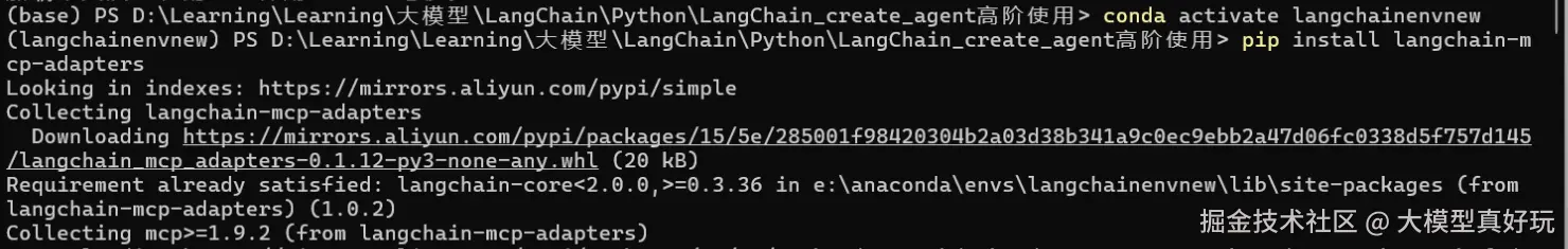 环境安装与配置:首先确保 LangChain 环境已激活,然后安装 MCP 适配器依赖:
