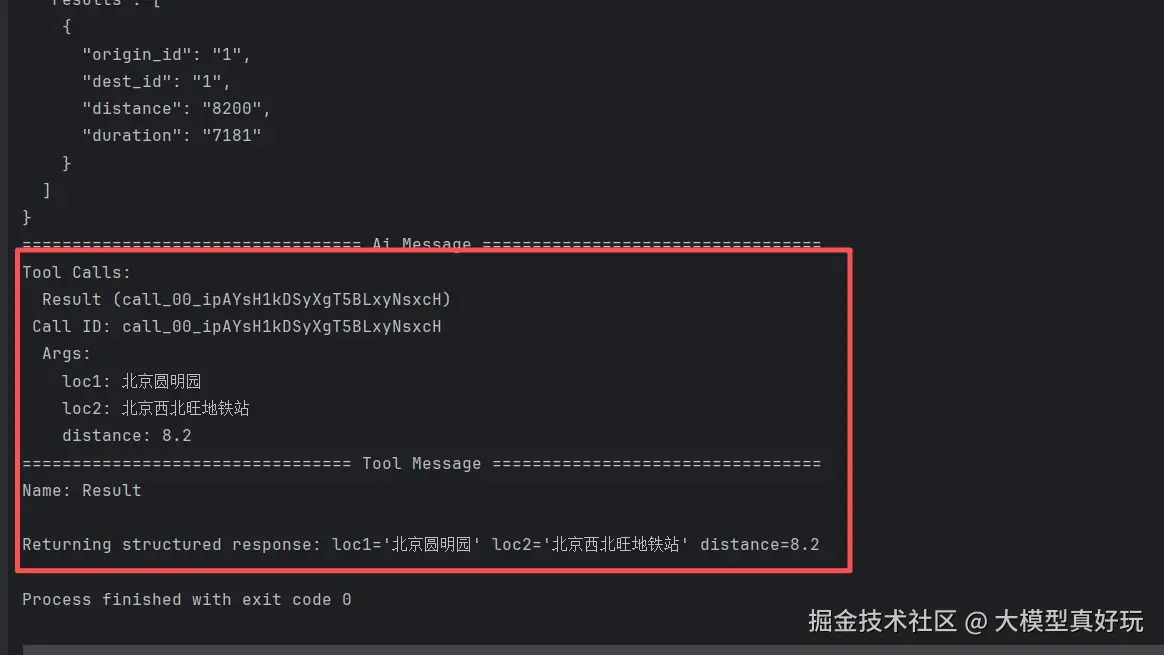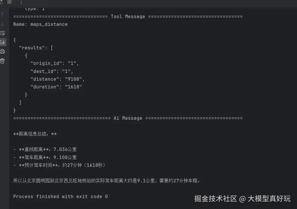 在《LangChain 1.0 速通指南(一)------LangChain 1.0 核心升级》中曾提到,create_agent API 的一个重要特性是支持结构化输出。这一功能极大地方便了后续的数据处理与系统集成。本节将基于前面高德地图 MCP 的示例,演示如何让智能体返回标准化的距离信息,格式如下: