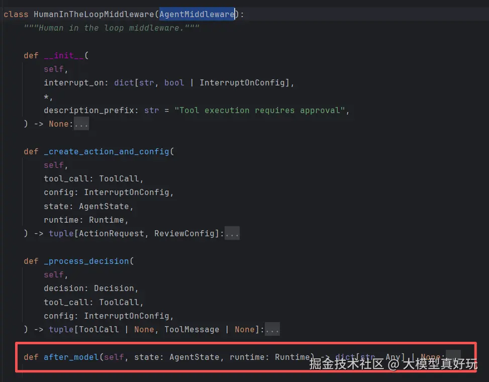 通过查看 HumanInTheLoopMiddleware 中间件的源码,我们发现它继承了 AgentMiddleware 基类。主要通过重写 after_model 方法来实现审批机制。其核心工作原理是:
