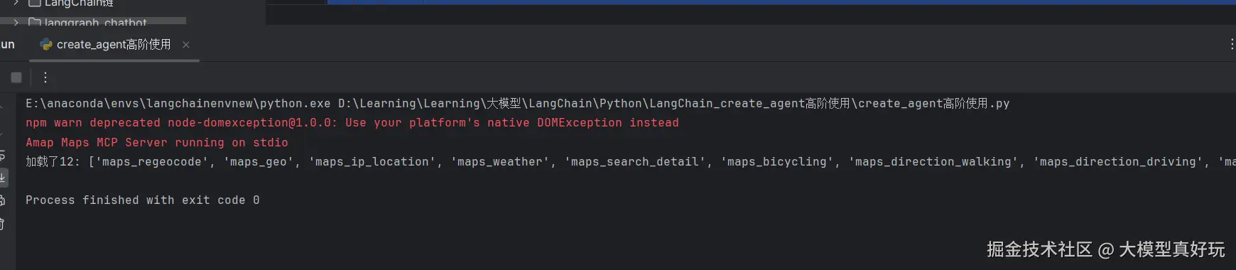 下面笔者通过使用 create_agent 接入高德地图 MCP 服务的完整案例,来学习如何在 LangChain 中使用 MCP。