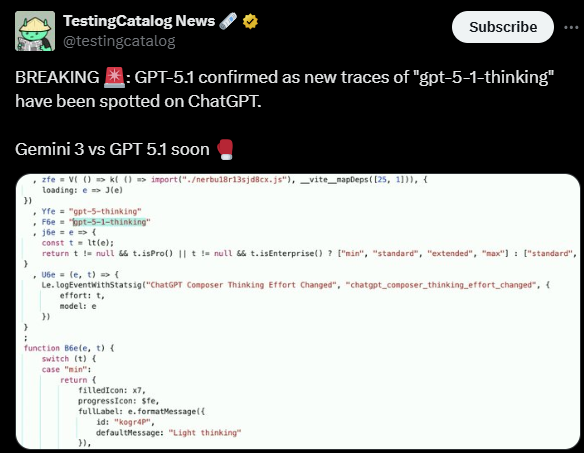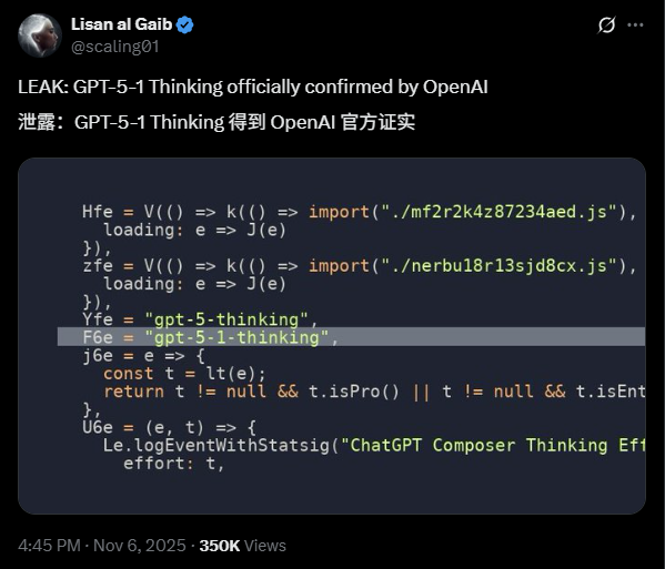 有开发者在 ChatGPT 的后端代码中发现了疑似 gpt-5-1-thinking 的模型字段,这意味着------OpenAI 可能已经在内部测试下一代推理模型 GPT-5.1。