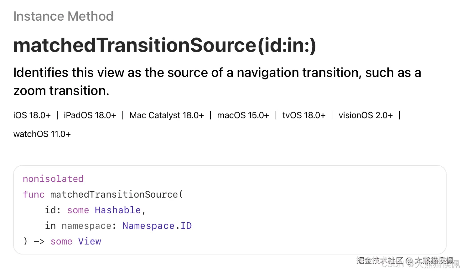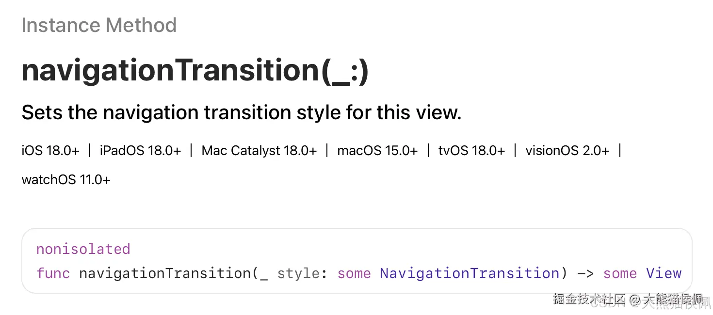 从 iOS 18(SwiftUI 6.0)开始,苹果为导航转场增加了全新的 navigationTransition 修改器方法,它的功用很简单------设置视图导航的转场样式: