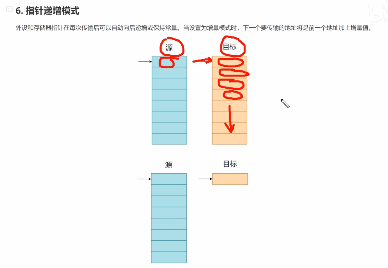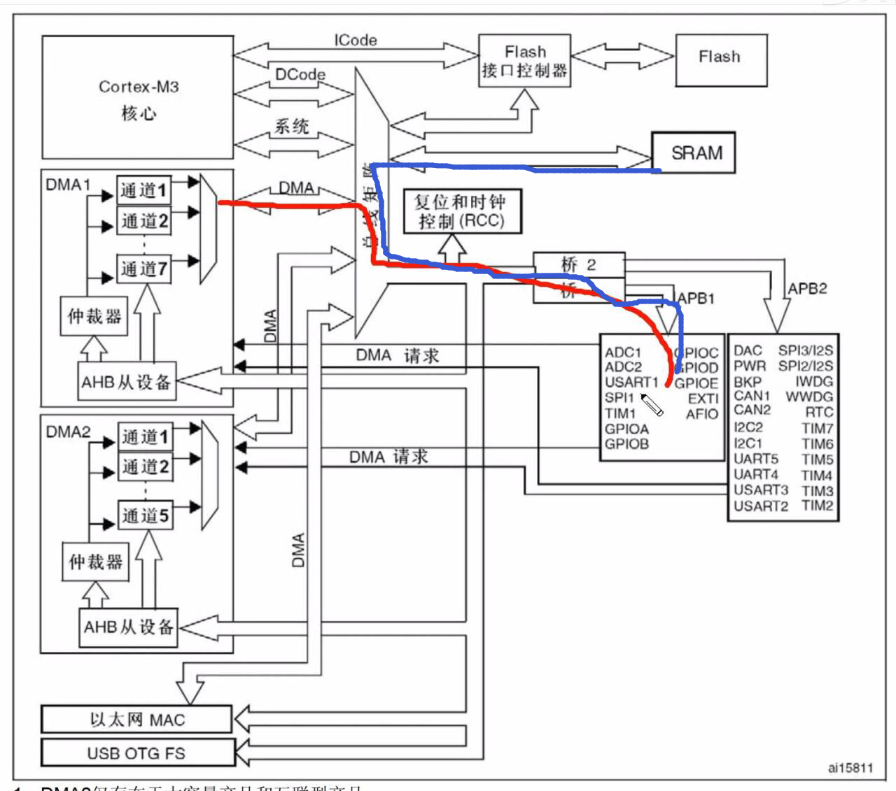 这里的外设是指spi,usart, IIC, adc等基于APB1、APB2或AHB时钟的外设,而这里的存储器包括自身的闪存(flash)或者内存(SRAM)以及外设的存储设备都可以作为访问地源或者目的。