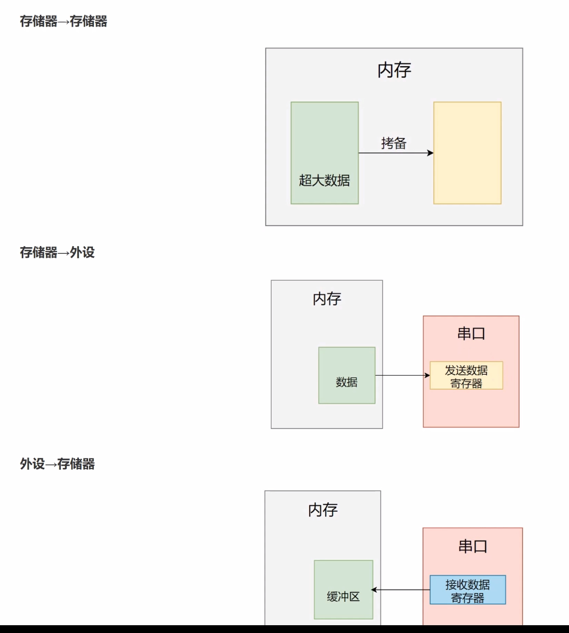 比如外设->存储器,DMA方式可以及时的将串口接收到的数据发送给内存缓冲区,不然下一次数据来的时候没及时搬运将会覆盖掉之前的数据,造成数据丢失。
